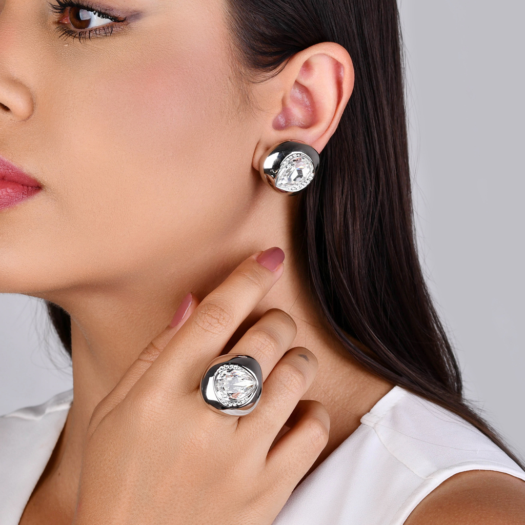 Conjunto composto por brinco e anel de estética robusta, estrutura marcante e acabamento impecável. O brilho das zircônias premium adiciona elegância e destaque imediato ao visual.